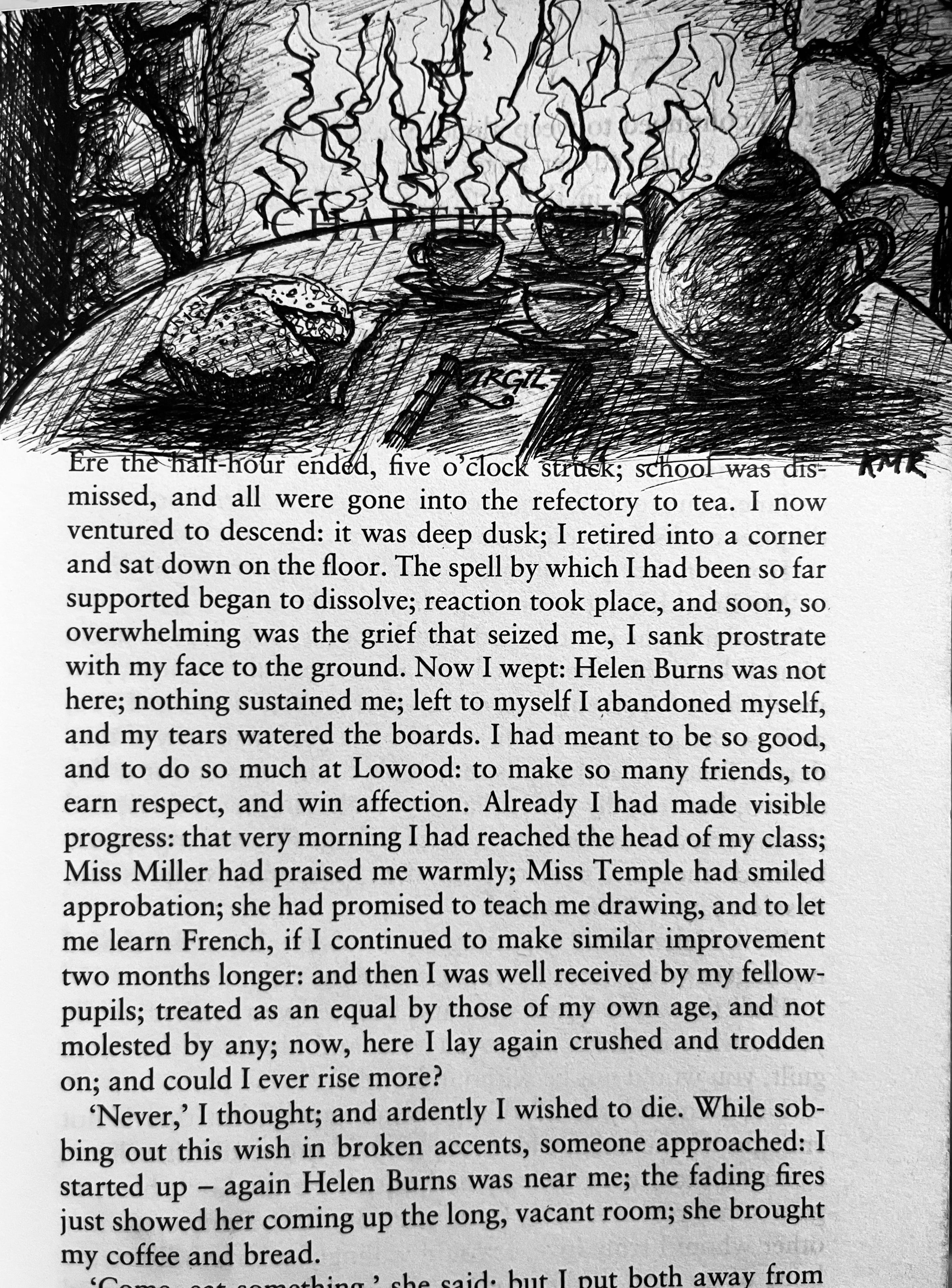 Ere the half-hour ended, five o’clock struck; school was dismissed, and all were gone into the refectory to tea. I now ventured to descend: it was deep dusk; I retired into a corner and sat down on the floor. The spell by which I had been so far supported began to dissolve; reaction took place, and soon, so overwhelming was the grief that seized me, I sank prostrate with my face to the ground. Now I wept: Helen Burns was not here; nothing sustained me; left to myself I abandoned myself, and my tears watered the boards. I had meant to be so good, and to do so much at Lowood: to make so many friends, to earn respect and win affection. Already I had made visible progress: that very morning I had reached the head of my class; Miss Miller had praised me warmly; Miss Temple had smiled approbation; she had promised to teach me drawing, and to let me learn French, if I continued to make similar improvement two months longer: and then I was well received by my fellow-pupils; treated as an equal by those of my own age, and not molested by any; now, here I lay again crushed and trodden on; and could I ever rise more?