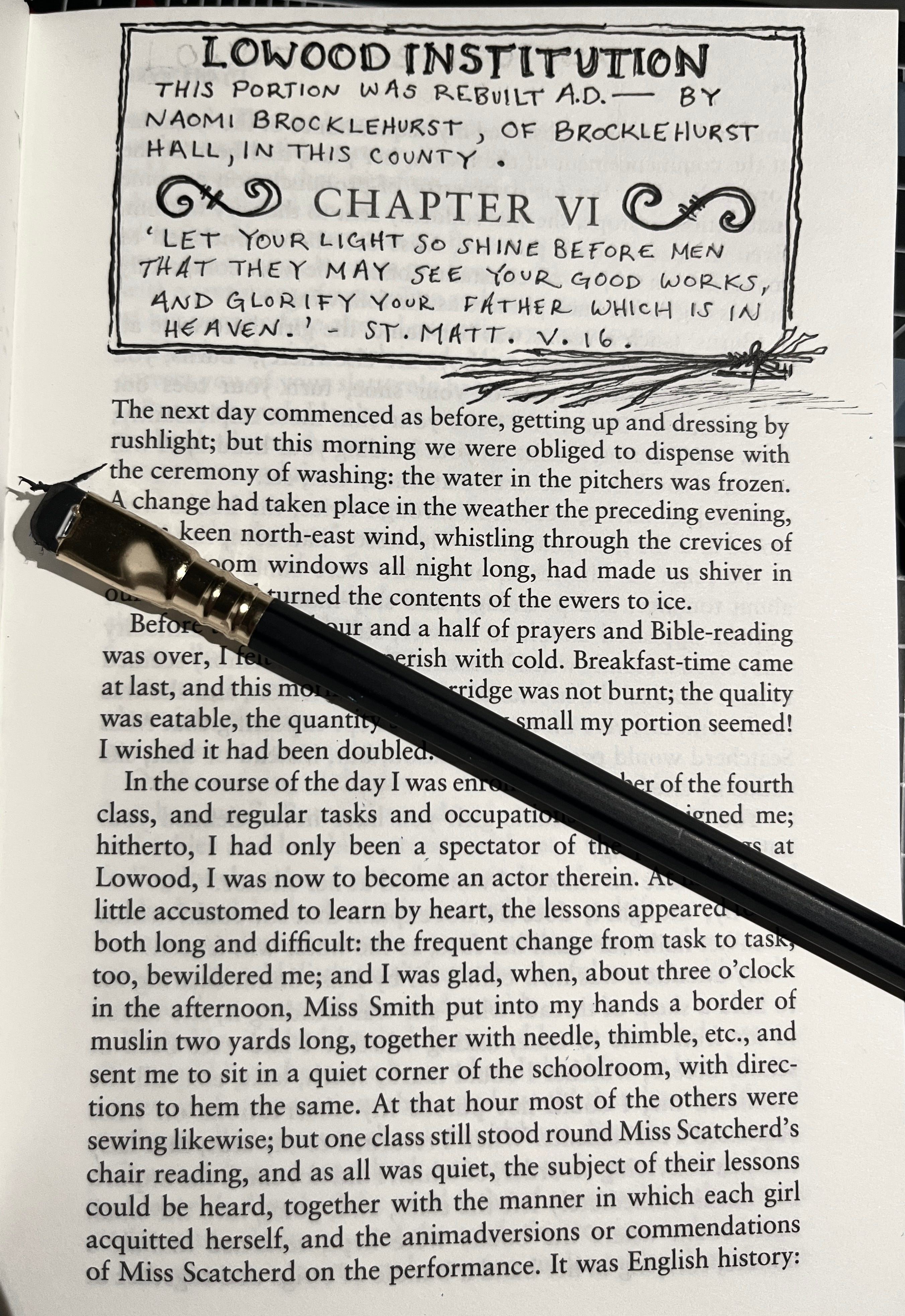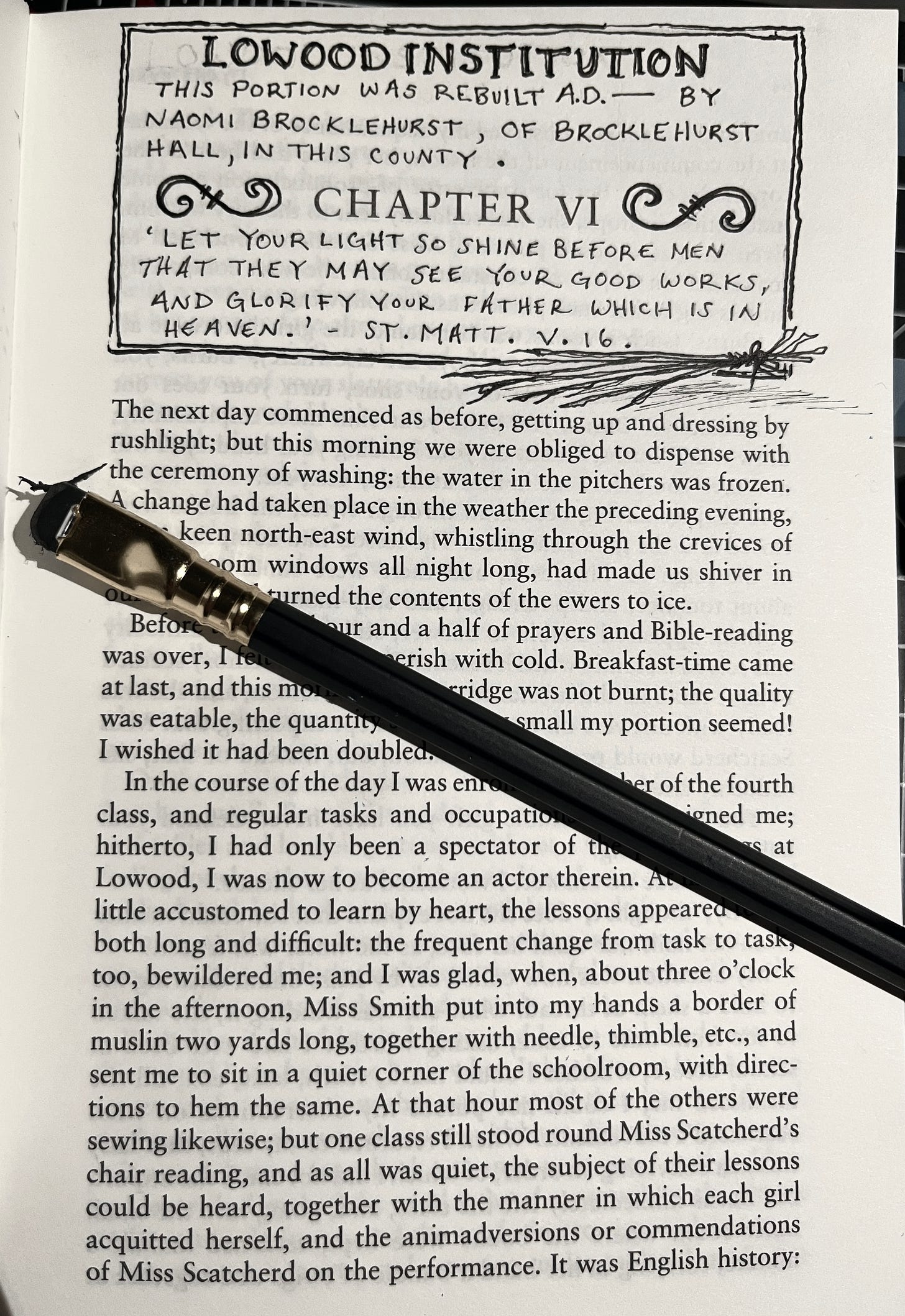 My attention was now called off by Miss Smith desiring me to hold a skein of thread: while she was winding it, she talked to me from time to time, asking whether I had ever been at school before, whether I could mark, stitch, knit, &c.; till she dismissed me, I could not pursue my observations on Miss Scatcherd’s movements. When I returned to my seat, that lady was just delivering an order of which I did not catch the import; but Burns immediately left the class, and going into the small inner room where the books were kept, returned in half a minute, carrying in her hand a bundle of twigs tied together at one end. This ominous tool she presented to Miss Scatcherd with a respectful curtesy; then she quietly, and without being told, unloosed her pinafore, and the teacher instantly and sharply inflicted on her neck a dozen strokes with the bunch of twigs. Not a tear rose to Burns’ eye; and, while I paused from my sewing, because my fingers quivered at this spectacle with a sentiment of unavailing and impotent anger, not a feature of her pensive face altered its ordinary expression.